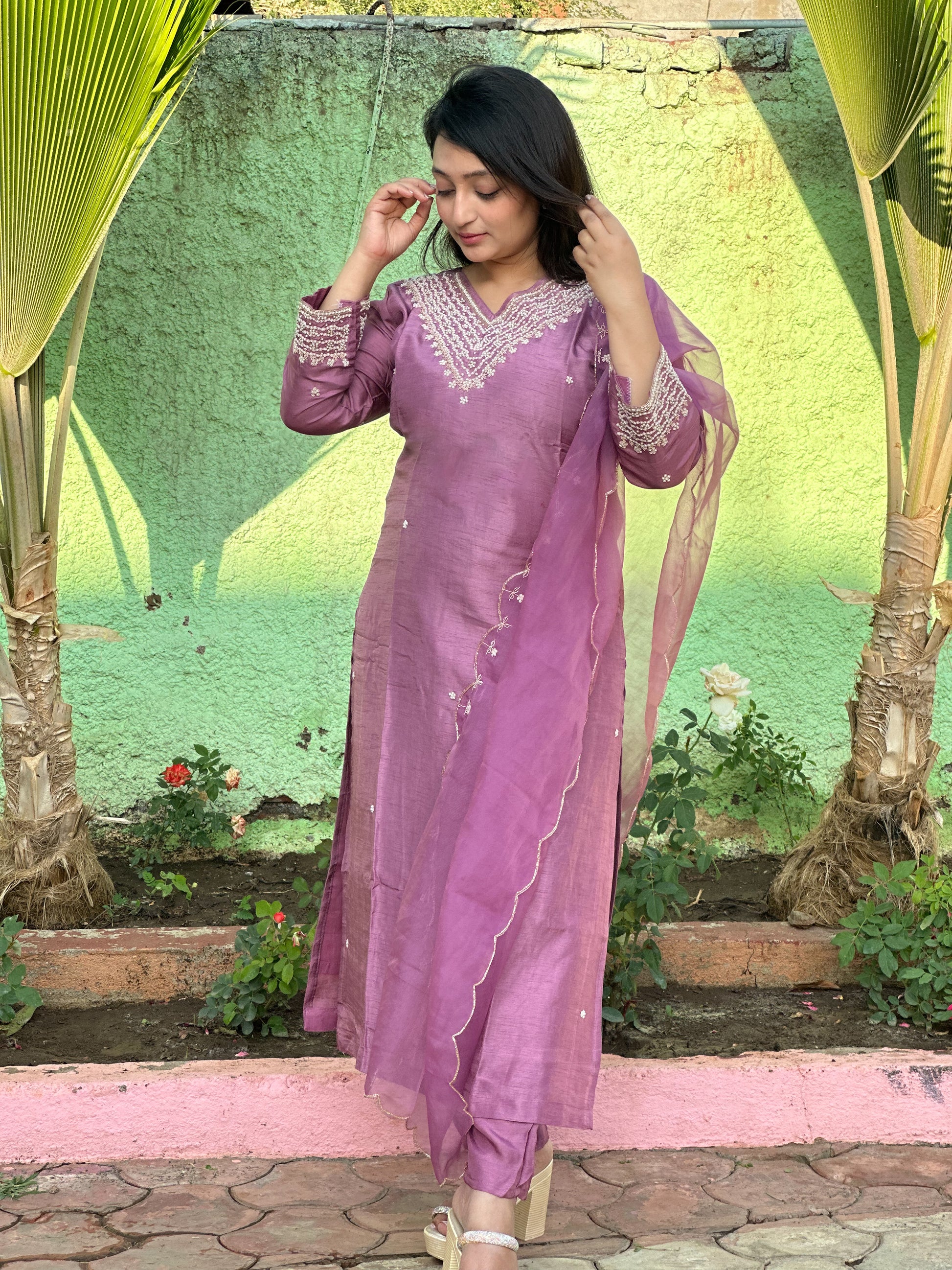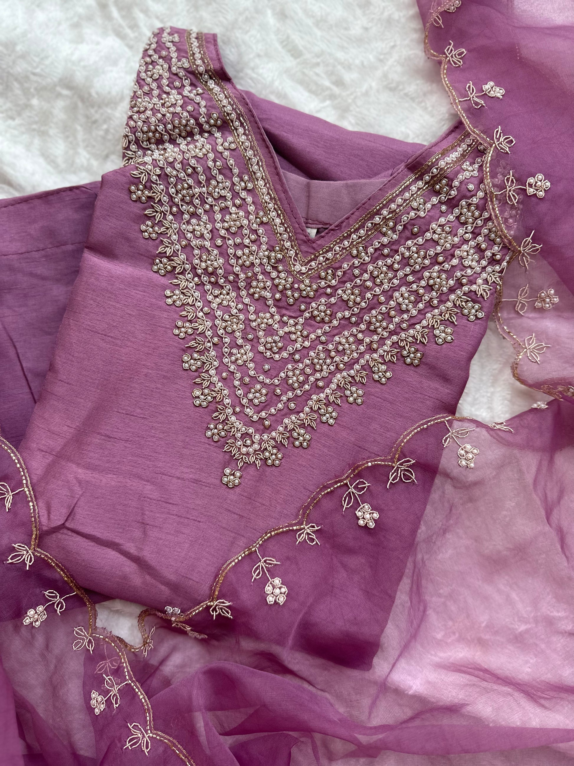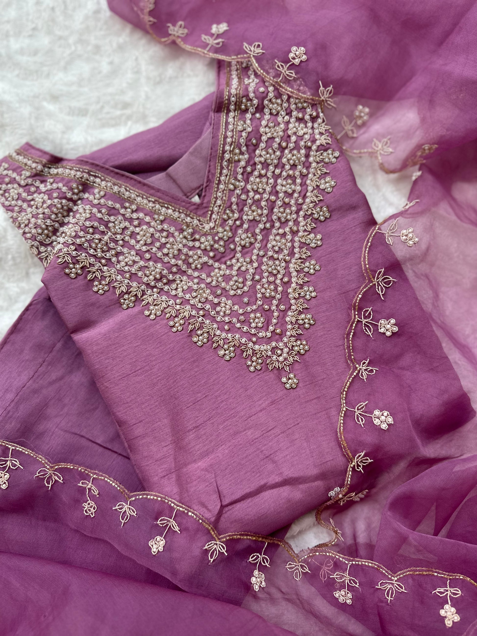 Hand embroidered silk set with heavy Moti hand embroidery on neck and organza dupatta