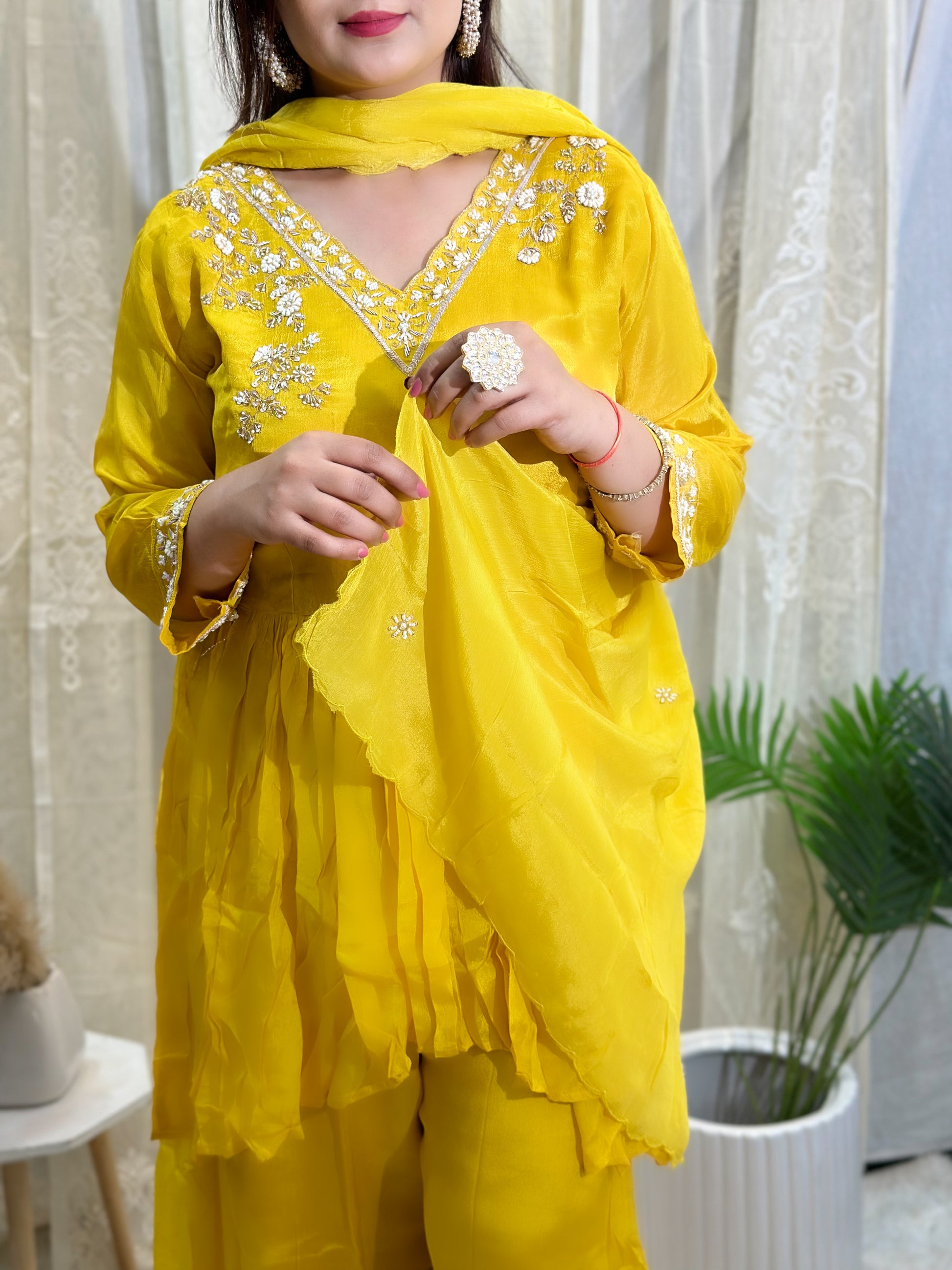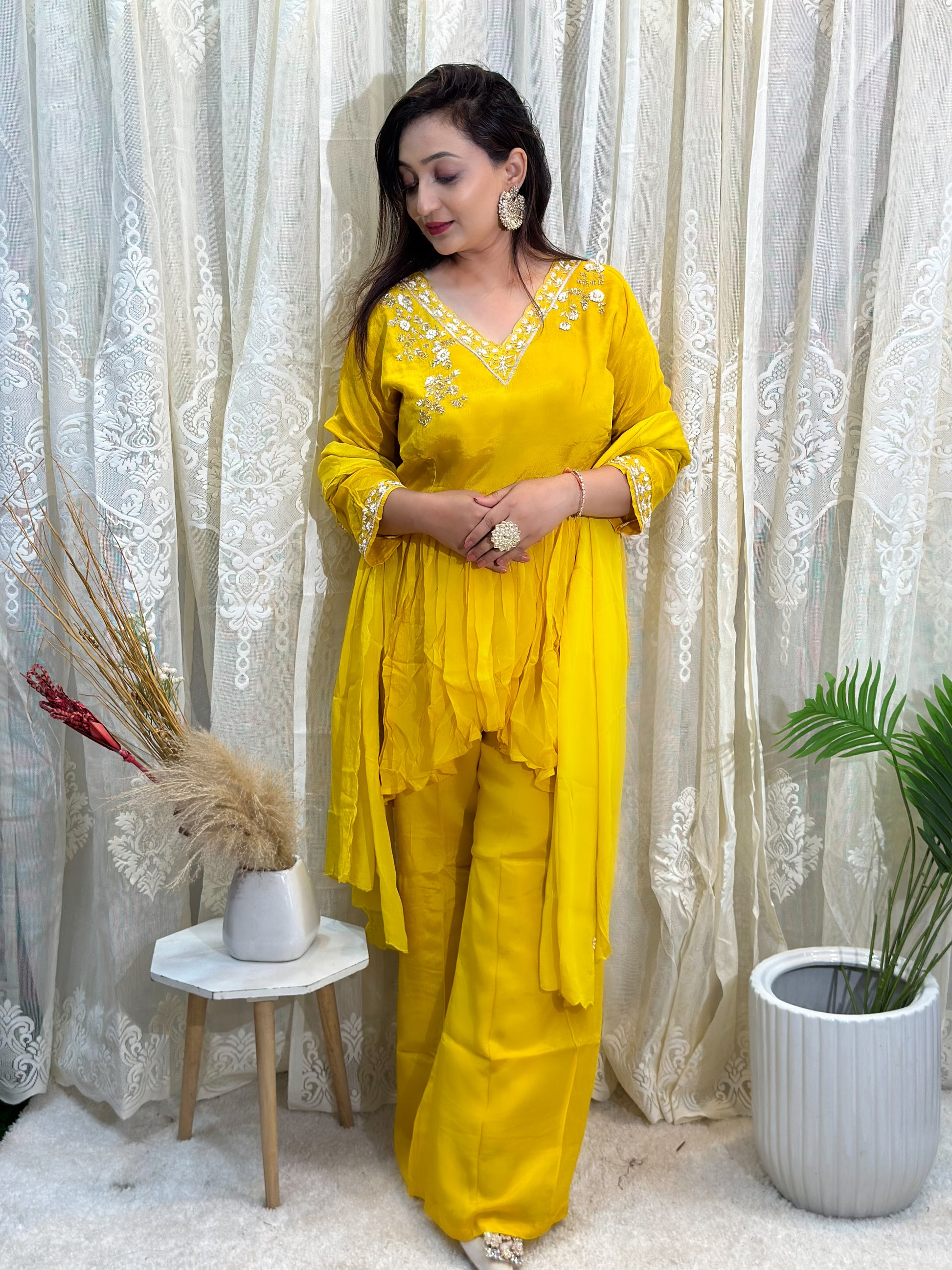 The striking yellow peplum top, adorned with intricate embroidery, is complemented by matching palazzo pants and a detailed embroidered dupatta