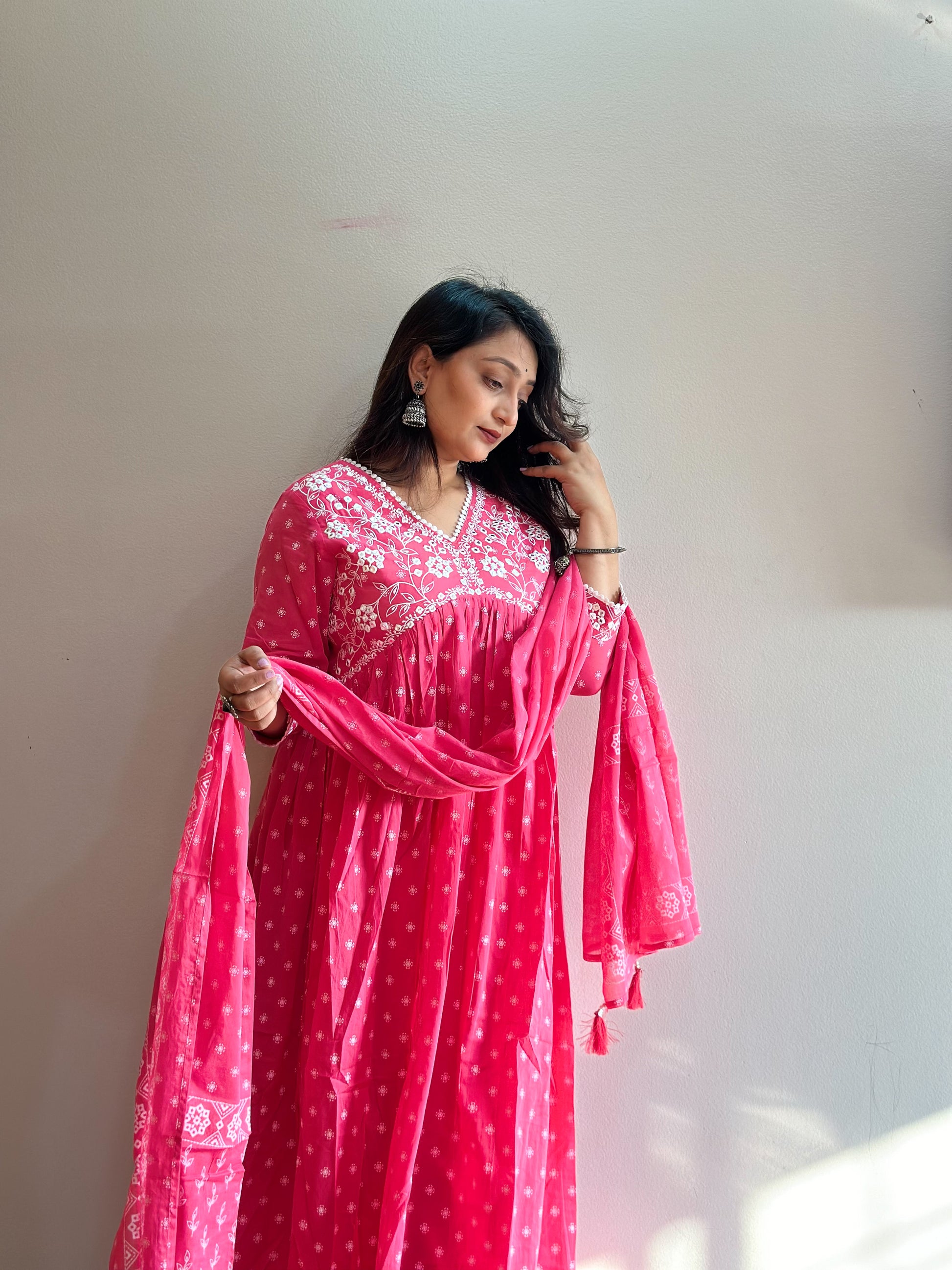 Pure Cotton Alia cut Anarkali kurta with chikenkari work comes with pants and dupatta
