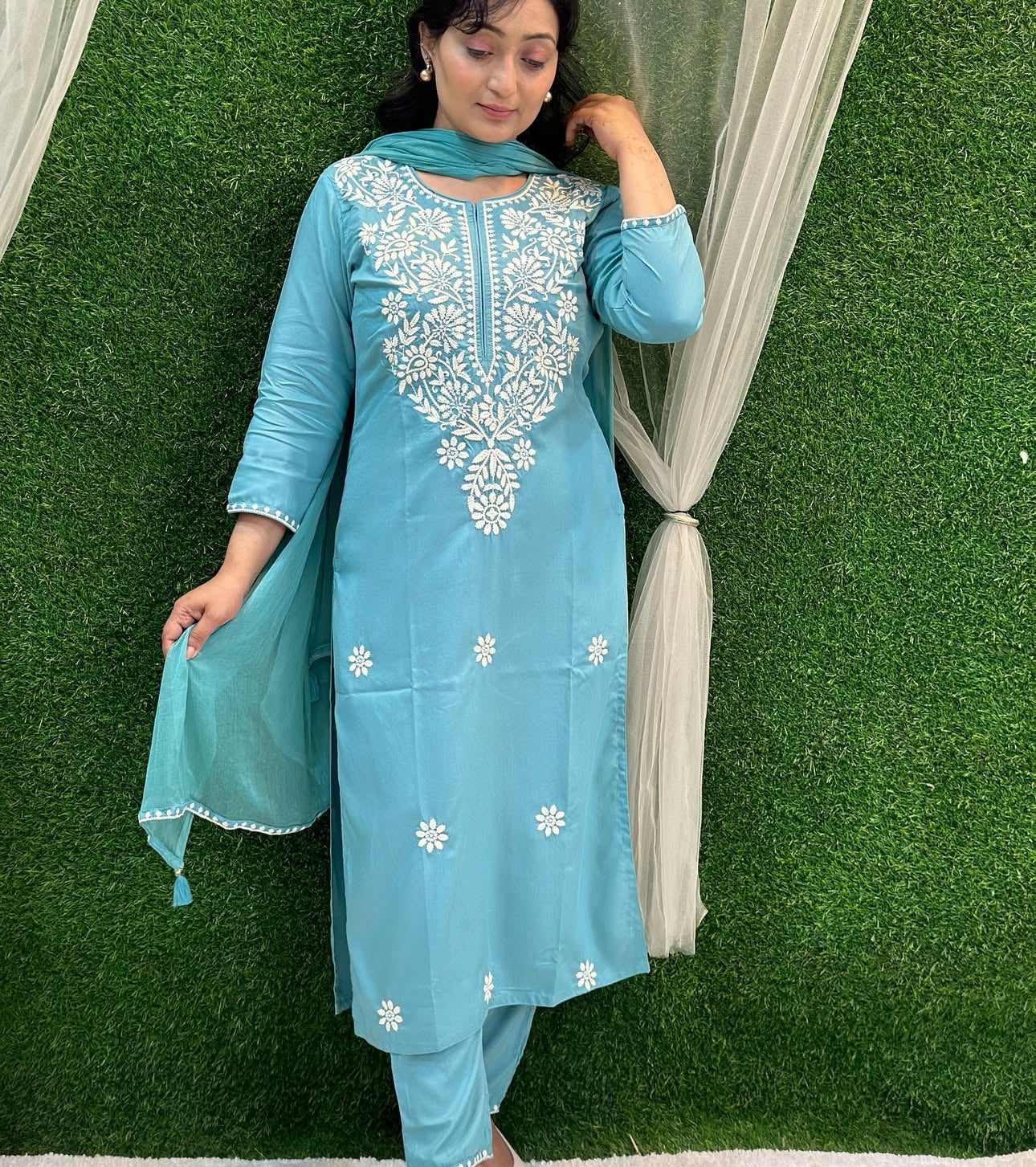 Embrace elegance with our exquisite Chikankari kurti, pant, and dupatta set! 💫 #EthnicCharm”