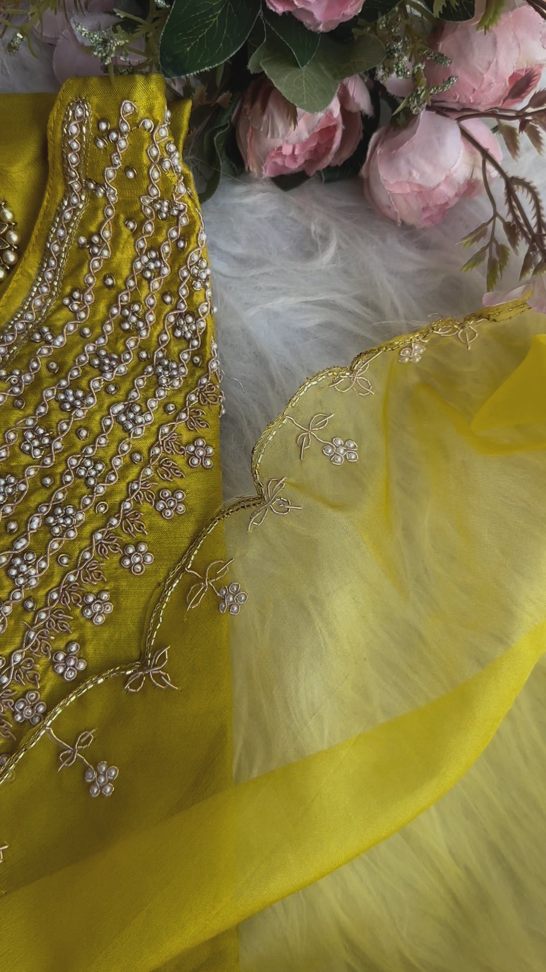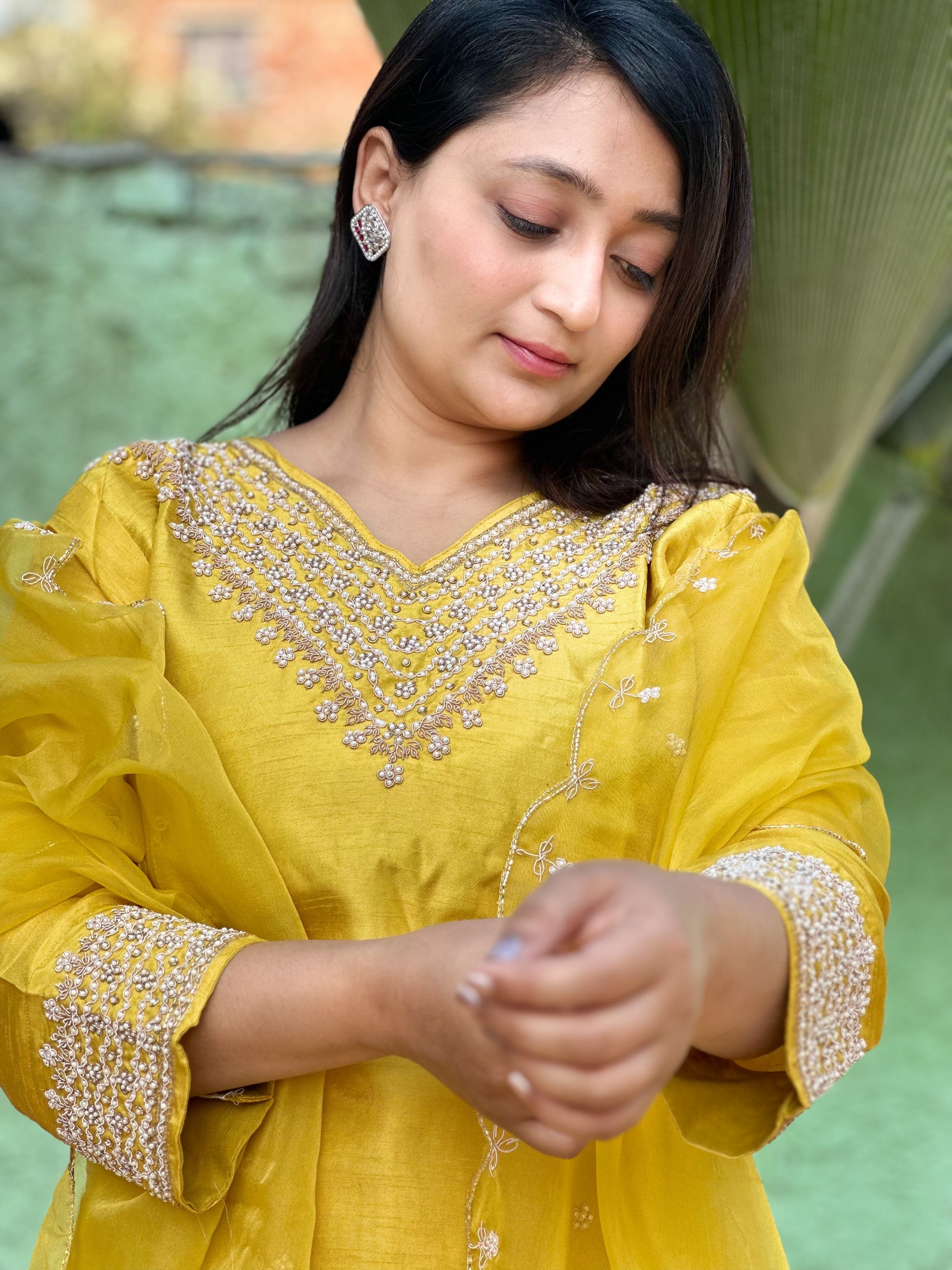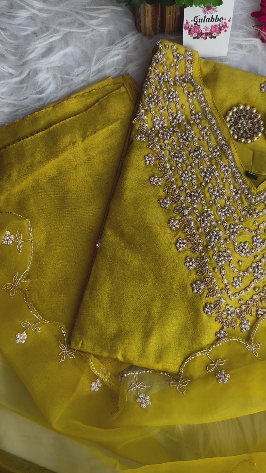 pure dola silk kurti with heavy hand handwork neckline and embroidered organza dupatta comes with attach lining and comfy pants