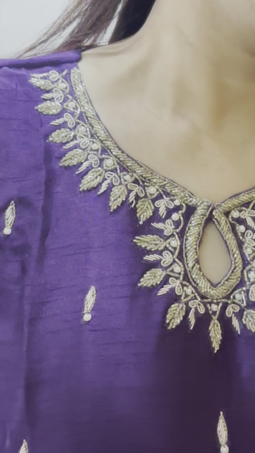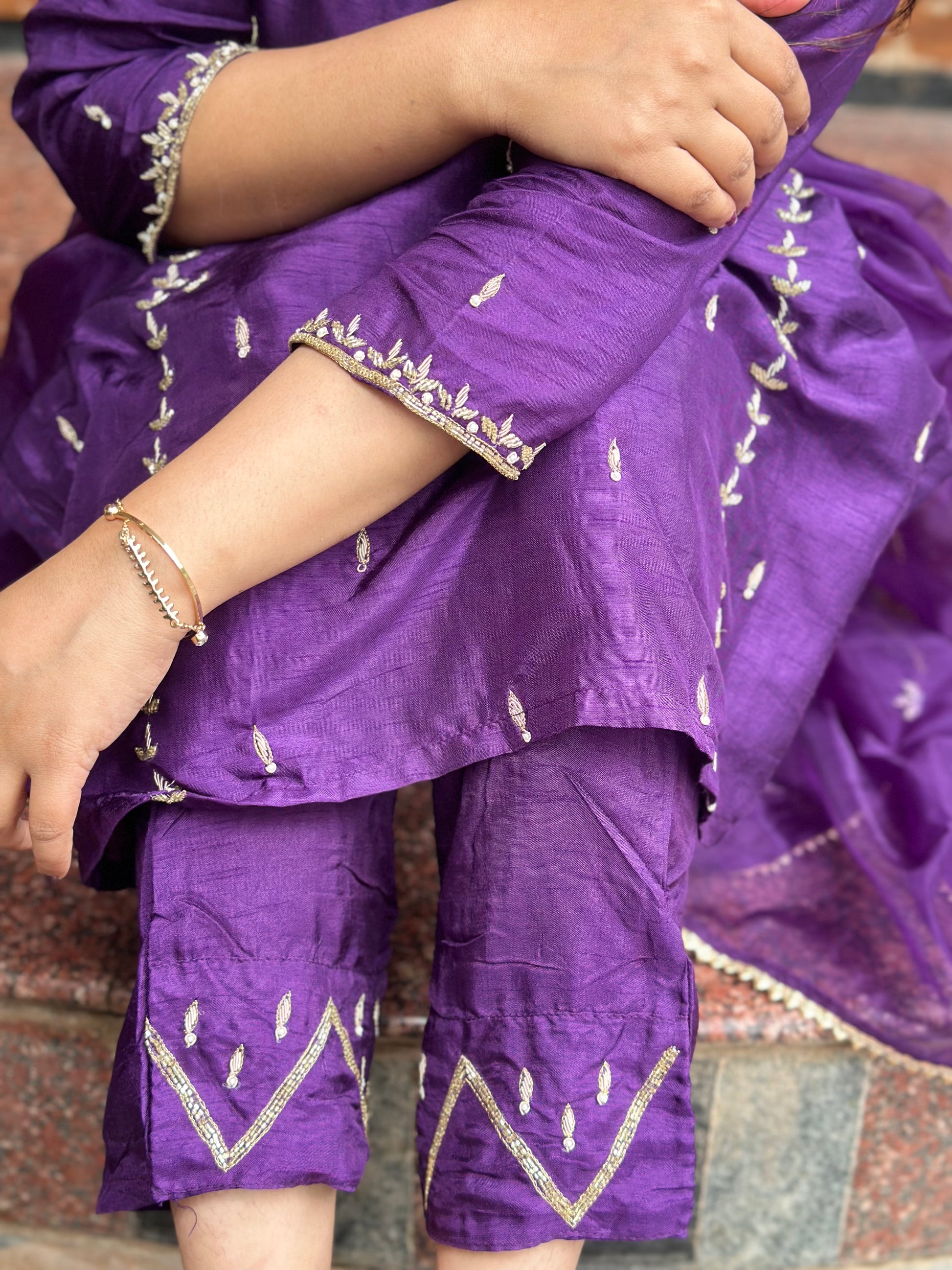 This purple silk set is an absolute stunner,this set features stunning delicate embroidery all over the kurti and pant and organza dupatta adds more spice to this dress.
