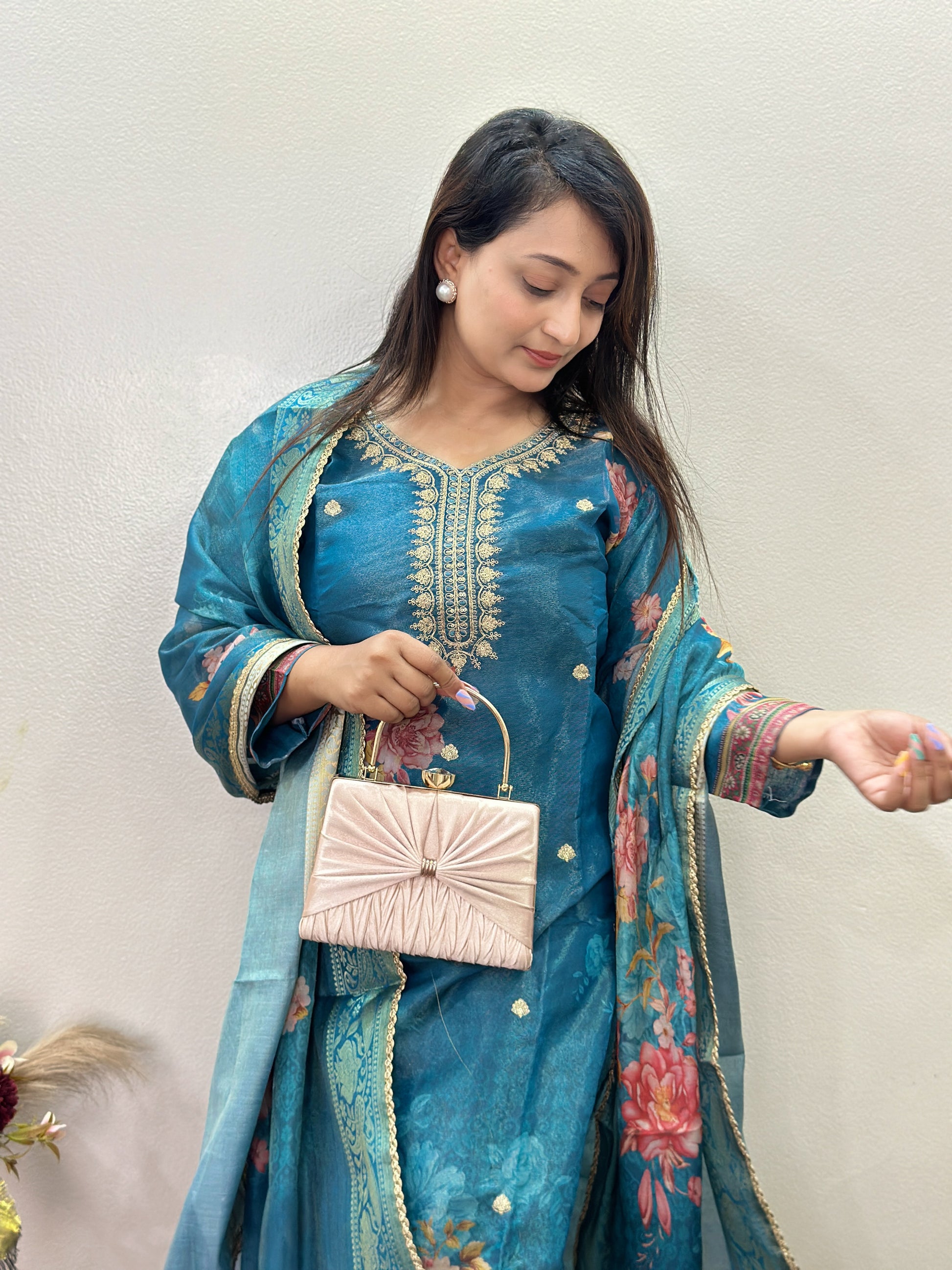 An elegant Floral Organza Kurta Set featuring a beautifully designed kurta, a delicate floral organza dupatta, and comfy pants.