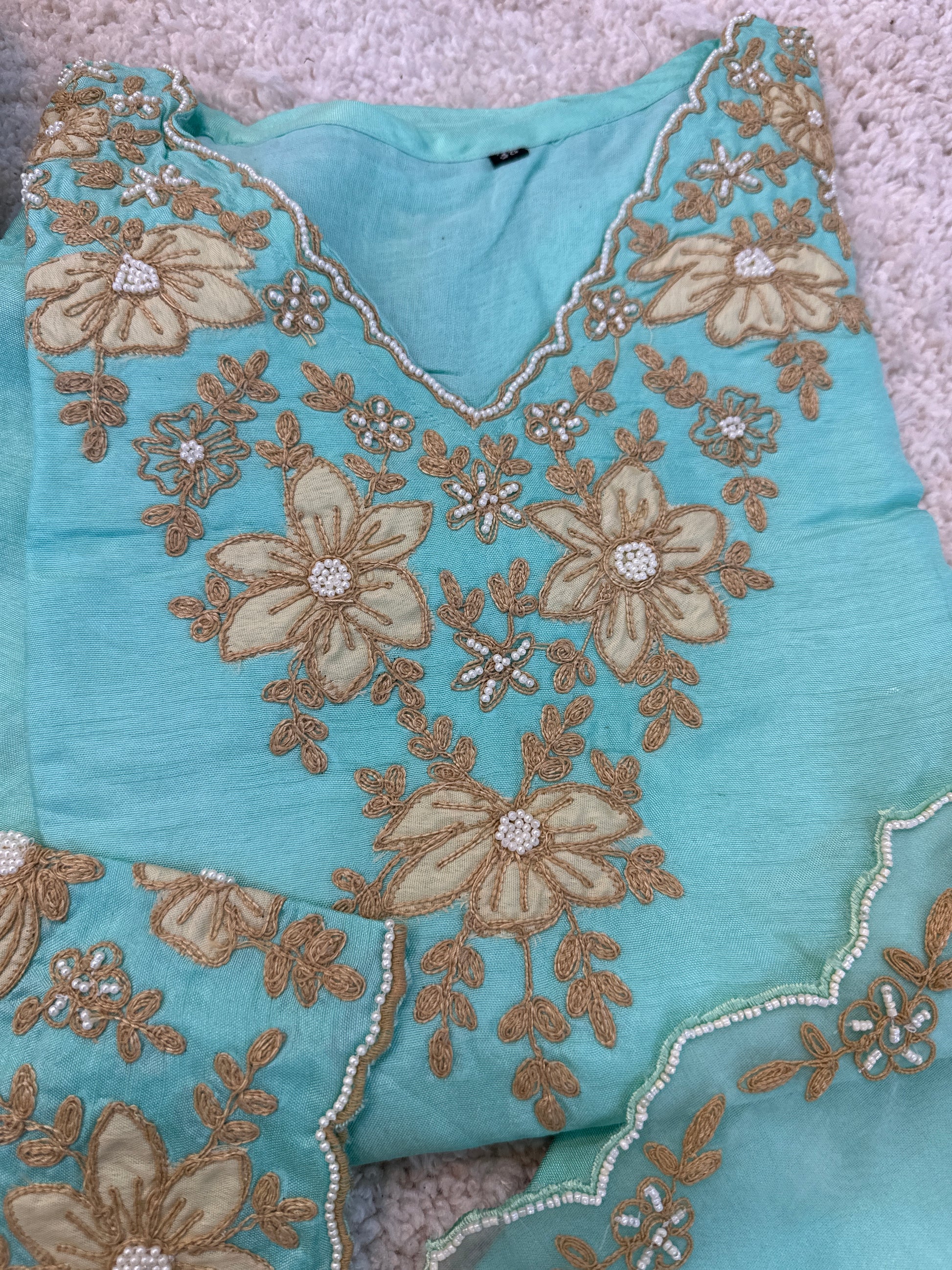 Discover the charm of our beautiful dola silk kurta, adorned with elegant ribbon embroidery on the yoke and daman, paired with stylish pants featuring delicate work and an embroidered organza dupatta.
