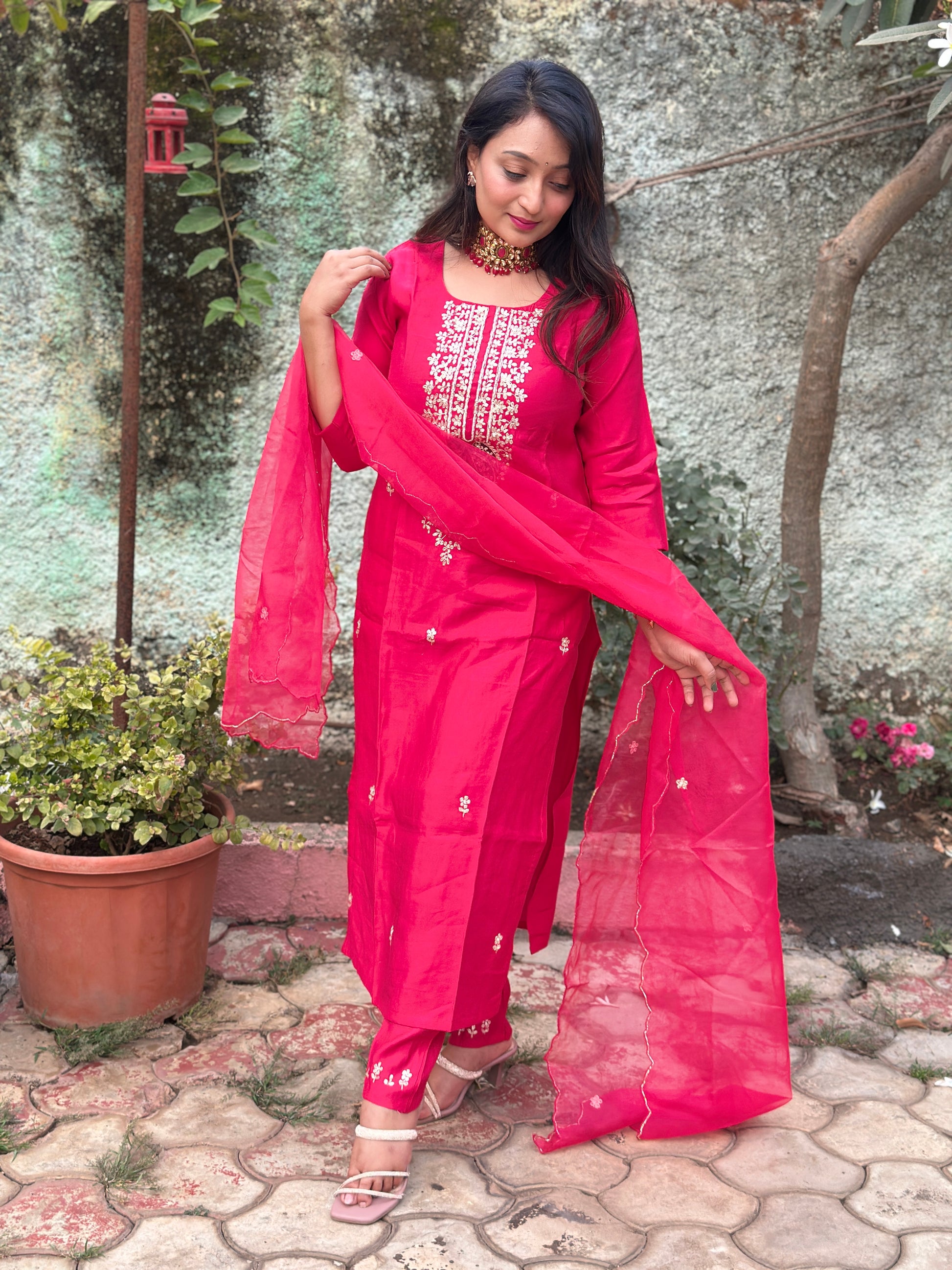 🪷Description: A stunning red dress with a flattering silhouette, featuring a lightweight organza dupatta for added elegance. Perfect for festive occasions.
