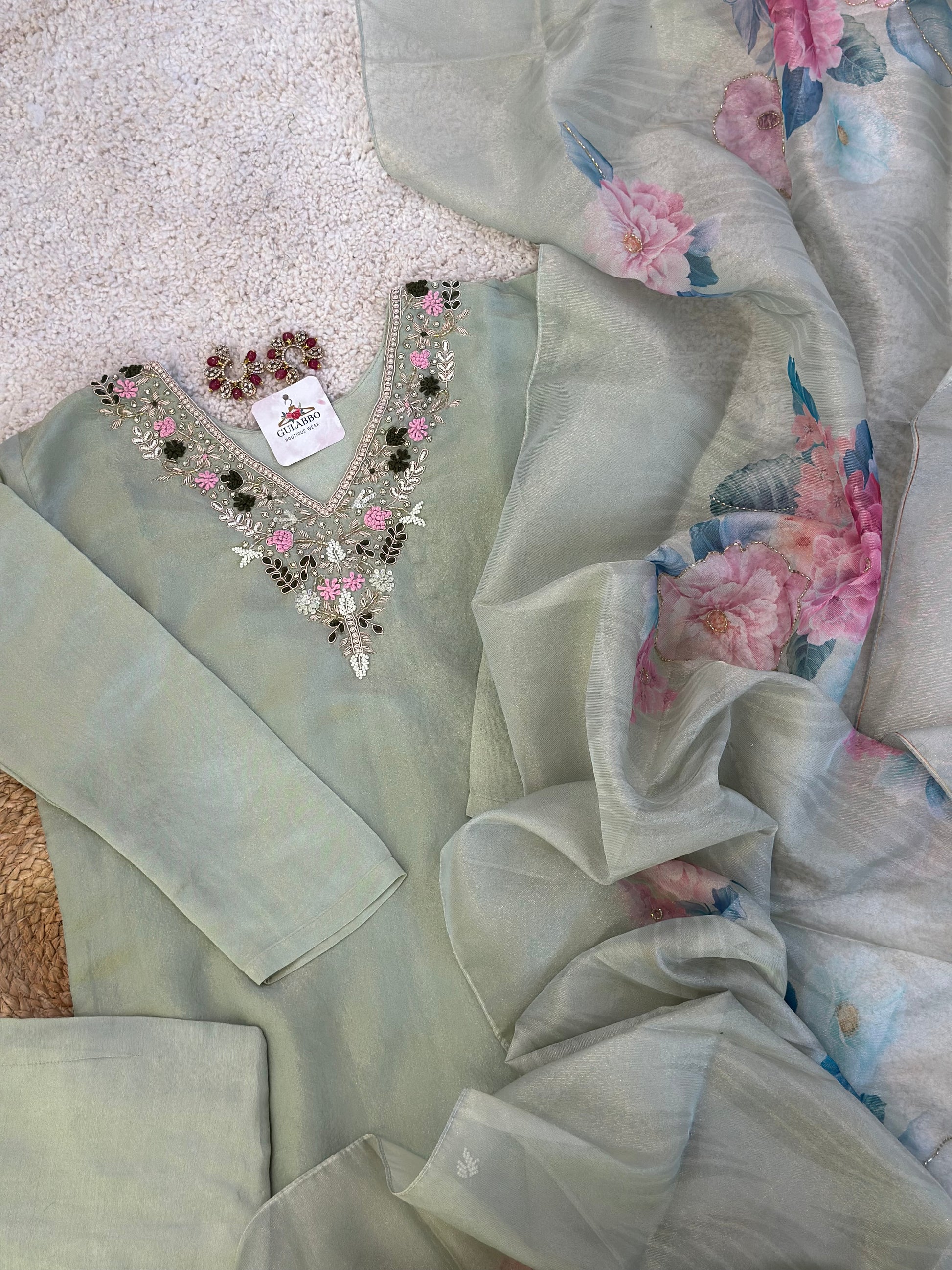 - **Dupatta:** Organza with floral embroidery