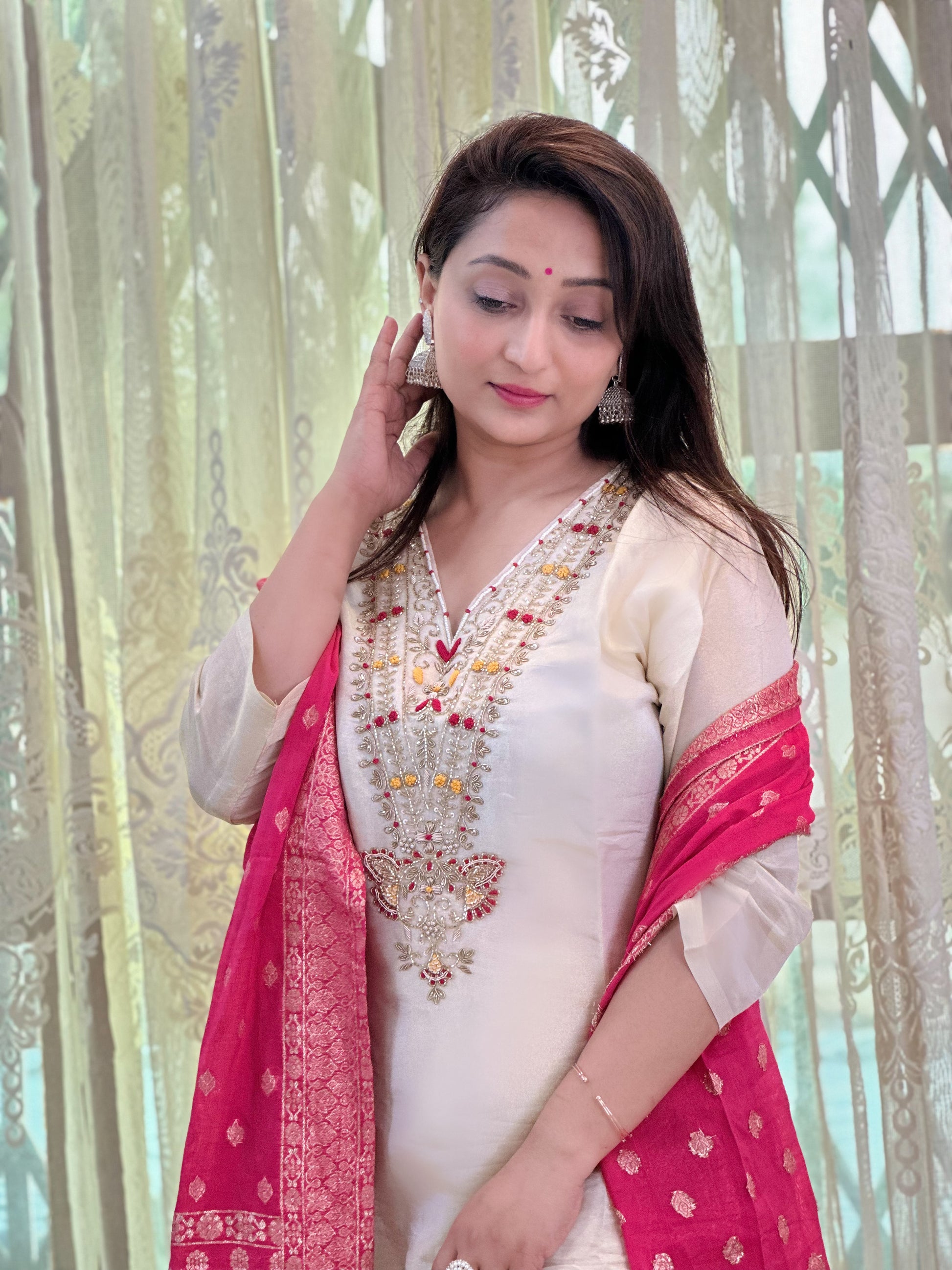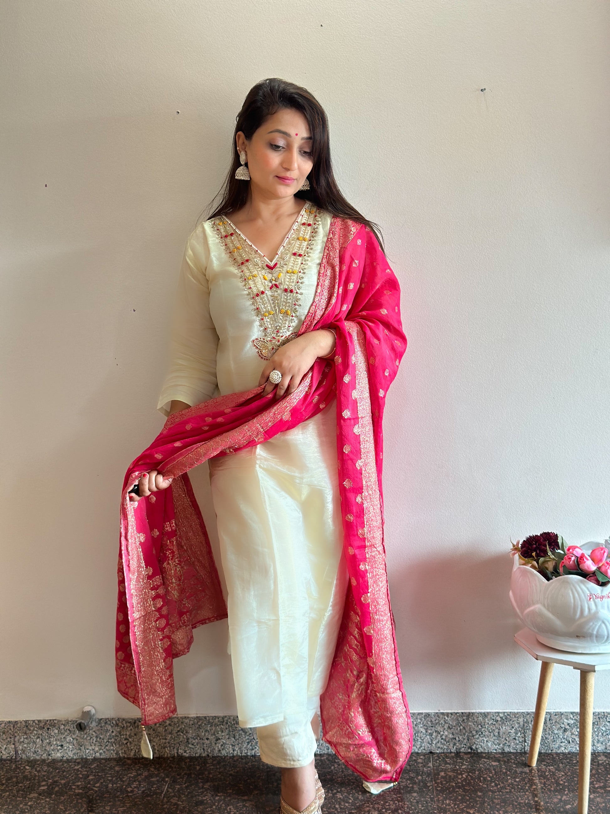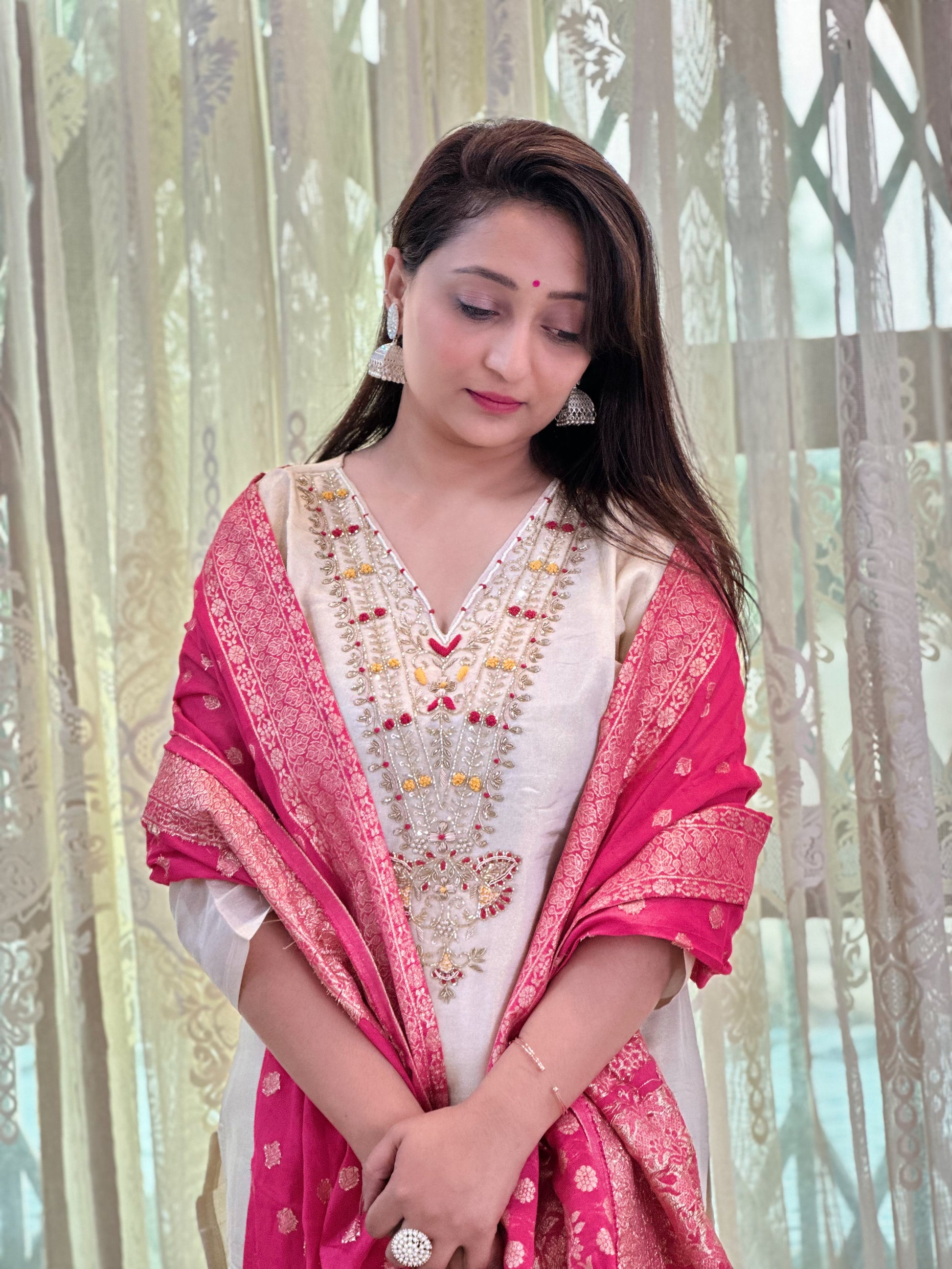 Elevate your ethnic wardrobe with this stunning white tissue silk embroidered set. Crafted from luxurious tissue silk, this ensemble features intricate embroidery that adds a touch of elegance and sophistication. The set is complemented by a beautiful Banarasi dupatta, showcasing traditional craftsmanship with its rich patterns and vibrant hues.