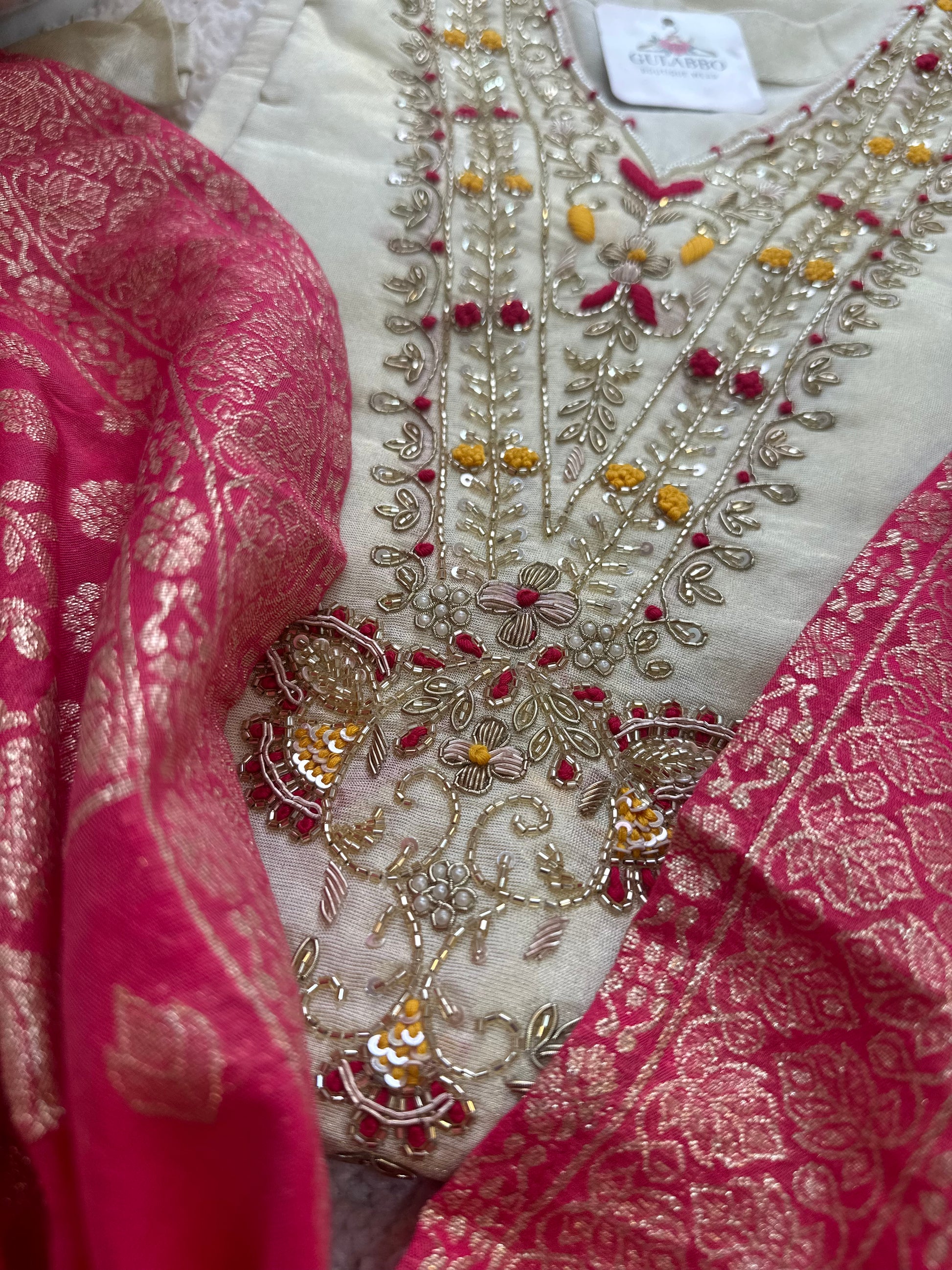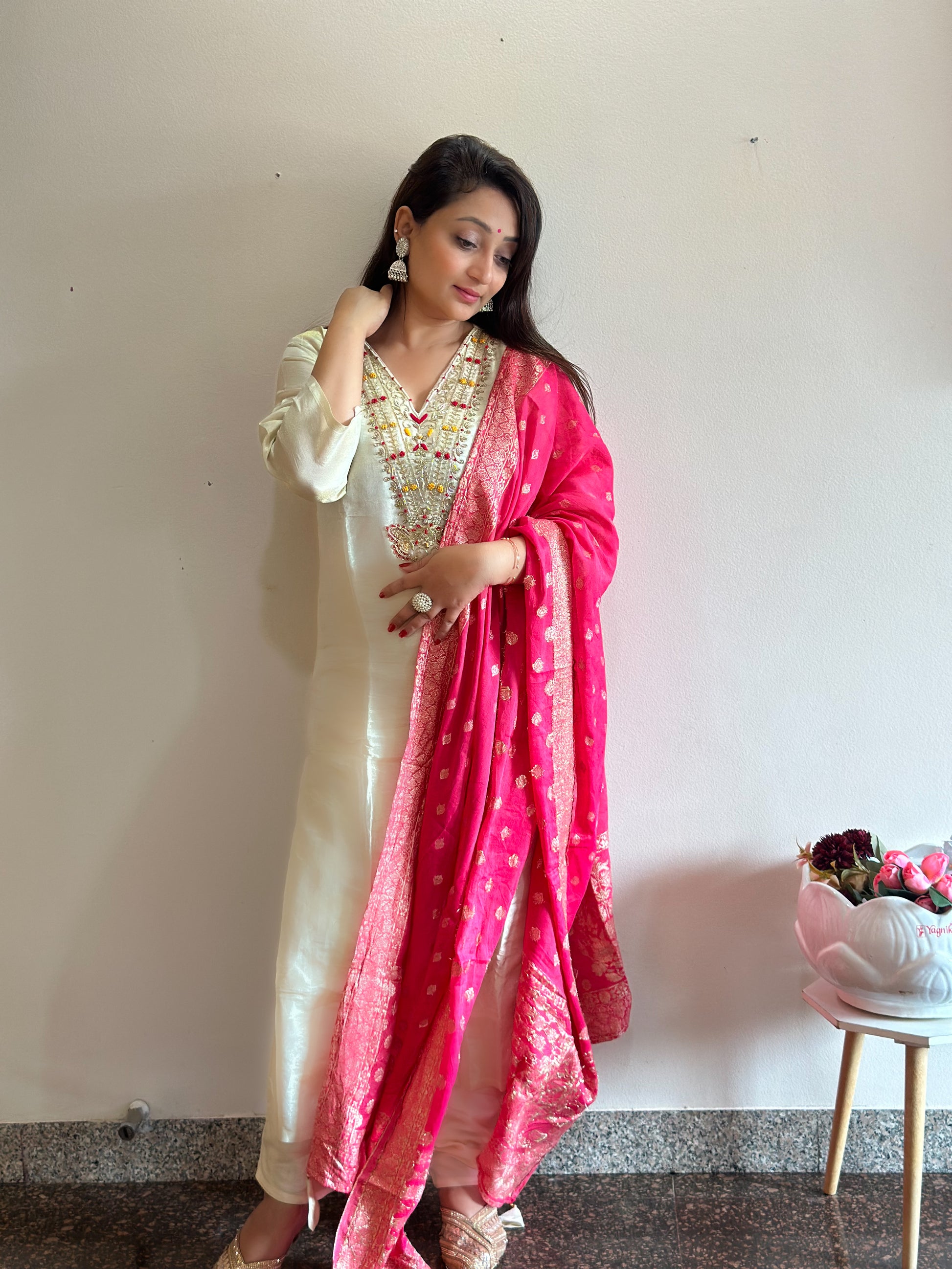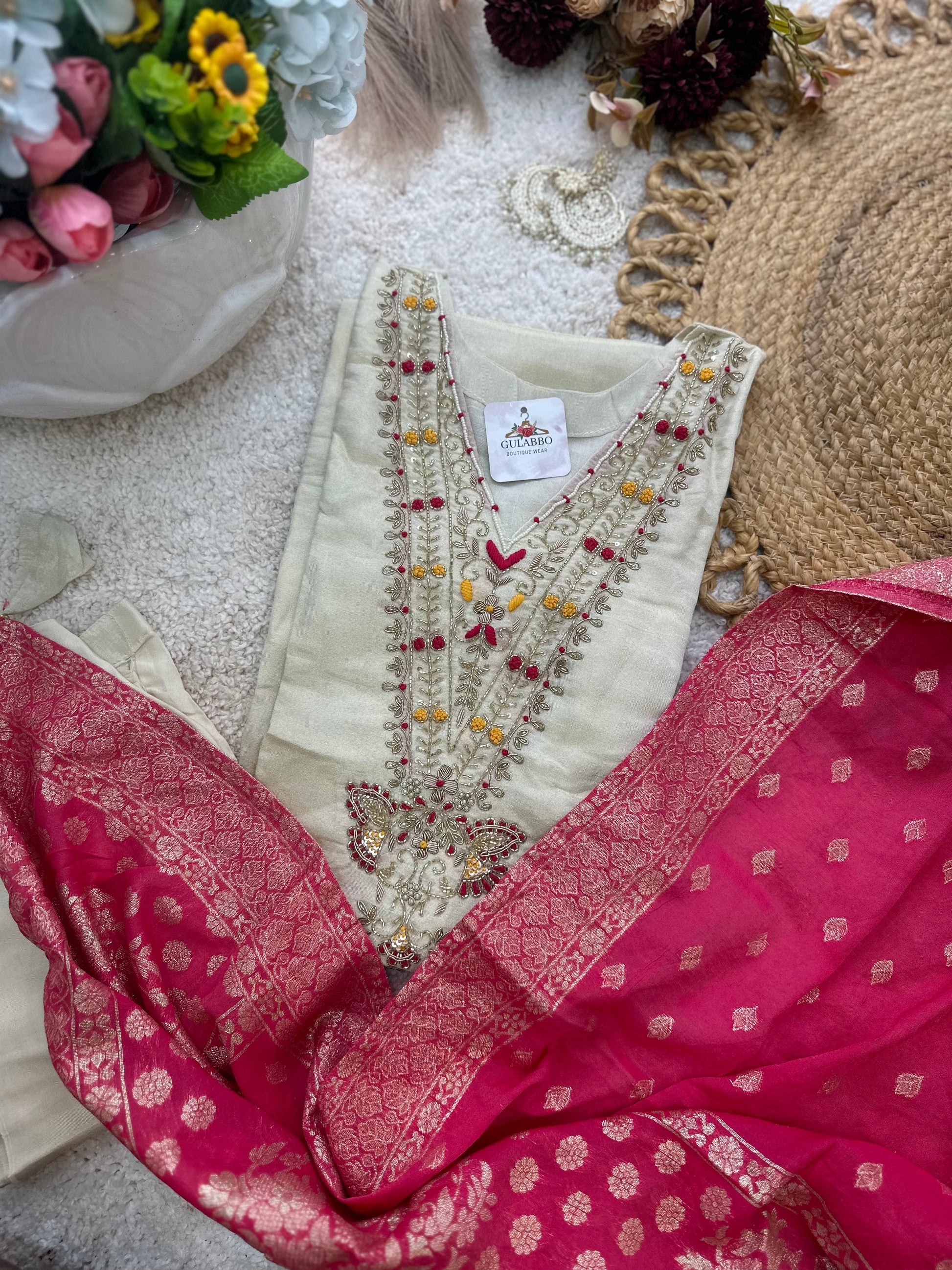 Elevate your ethnic wardrobe with this stunning white tissue silk embroidered set. Crafted from luxurious tissue silk, this ensemble features intricate embroidery that adds a touch of elegance and sophistication. The set is complemented by a beautiful Banarasi dupatta, showcasing traditional craftsmanship with its rich patterns and vibrant hues.